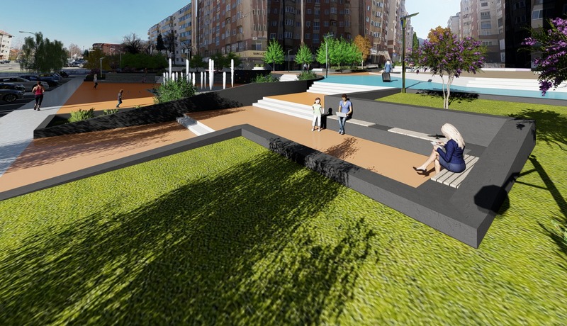 La fântâna arteziană dinspre strada Tâmpei, va fi refacuta în întregime, fiind înlocuită cu o fântână de pardoseală cu joc de apă şi lumini, astfel încât utilizatorii spaţiului să poată interacţiona direct cu apa şi să aibă posibilitatea reală să se răcorească în zilele toride. Fântâna va fi înconjurată de un amfiteatru cu o capacitate de aproxiamtiv 100 de locuri, care va putea fi utilizat fie ca loc de socializare, fie ca tribună pentru diferite evenimente, caz în care scena va putea fi amenajată chiar pe platforma fântânii arteziene, desigur, cu apa oprită. Pentru asigurarea ritmului zonei, forma fântânii şi dimensiunile sale vor fi replicate în nivelul superior, la nivelul pardoselii pietonalului, unde amprenta fântânii va fi realizata din lemn de ipe (un lemn de origine braziliană, extrem de dur şi foarte rezistent în timp) şi va fi marginita de arbori.