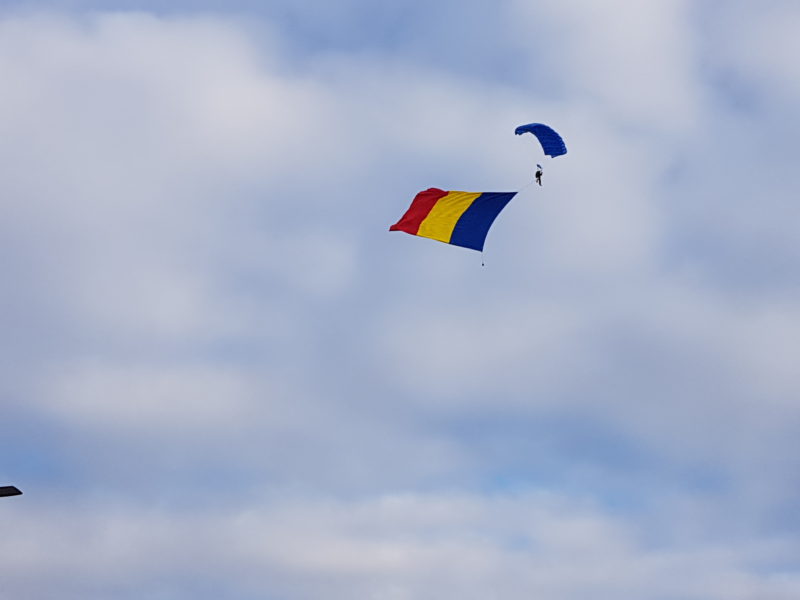 Parașutistul a adus la sol un drapel de mari dimensiuni, în aplauzele celor prezenți, pe care l-a predat autorităților, și a dat astfel startul paradei militare de Ziua Națională a României.