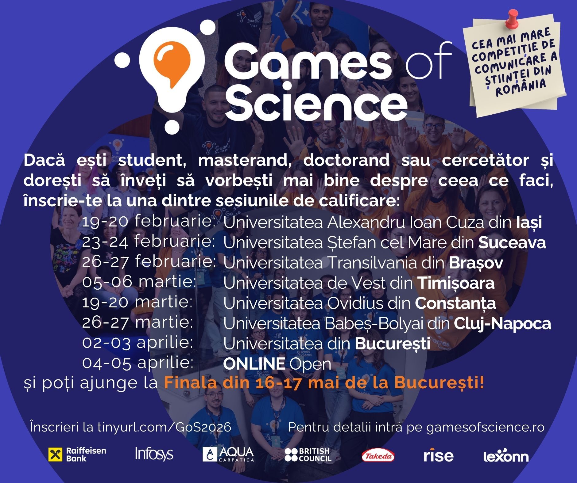 Games of Science este un program național dedicat dezvoltării abilităților de comunicare publică în rândul tinerilor cercetători, fiind susținut de universități și parteneri din mediul privat. Printre susținătorii ediției din 2026 se numără Raiffeisen Bank, Infosys, Aqua Carpatica, Takeda, Romanian InSpace Engineering, Lexonn și British Council.