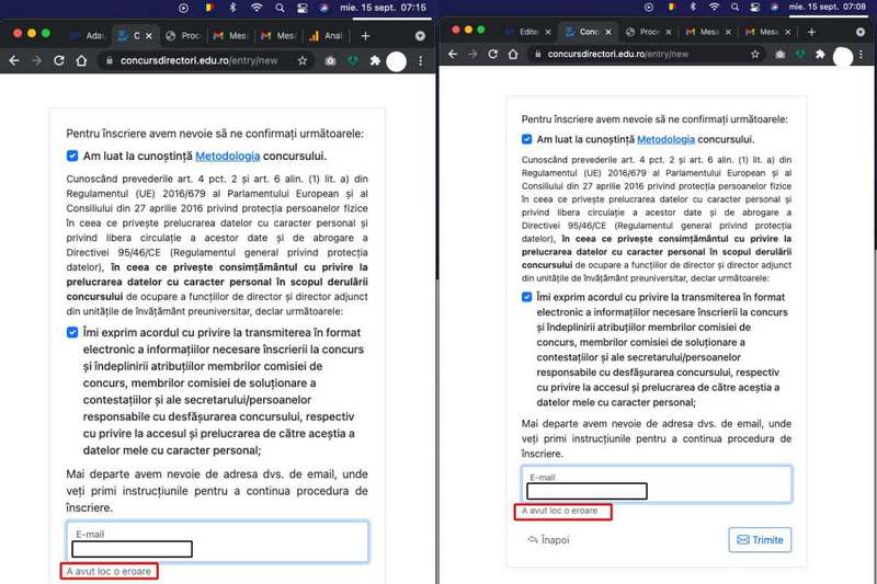 În această dimineață, la ora 7 a fost deschisă înscrierea pe platforma concursdirectori.edu.ro, pentru desemnarea directorilor şi directorilor adjuncţi ai unităţilor de învăţământ preuniversitar. Încă dn primele minute însă, mesajul afișat a fosr „A apărut o eroare”, atunci când vreun candidat a dorit să își introducă adresa de email, acesta fiind primul pas din procedura de înscriere.