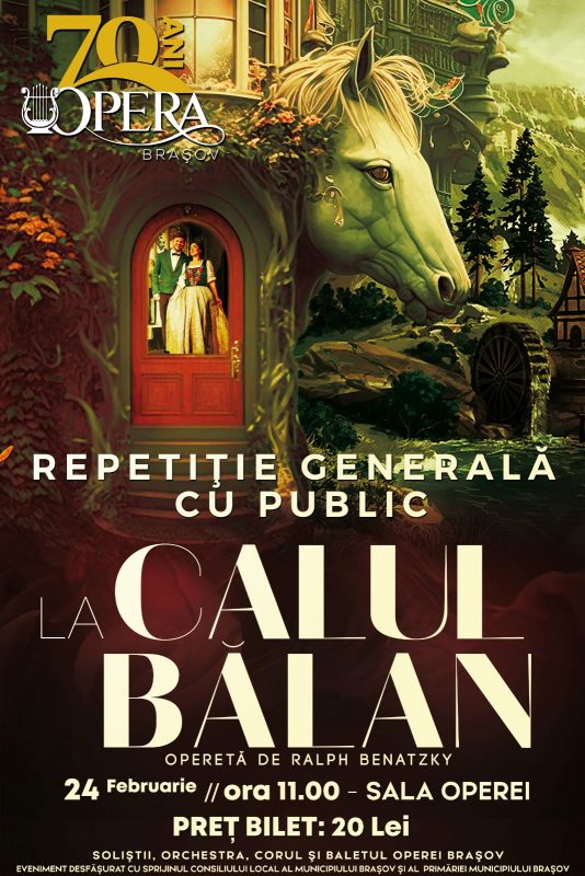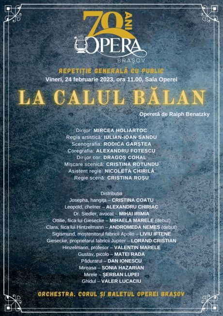 Vineri, 24 februarie 2023, de la ora 11.00, în sala de pe str. Bisericii Române nr. 51, Opera Braşov invită publicul la repetiția generală a operetei „La calul bălan” de R. Benatzky!