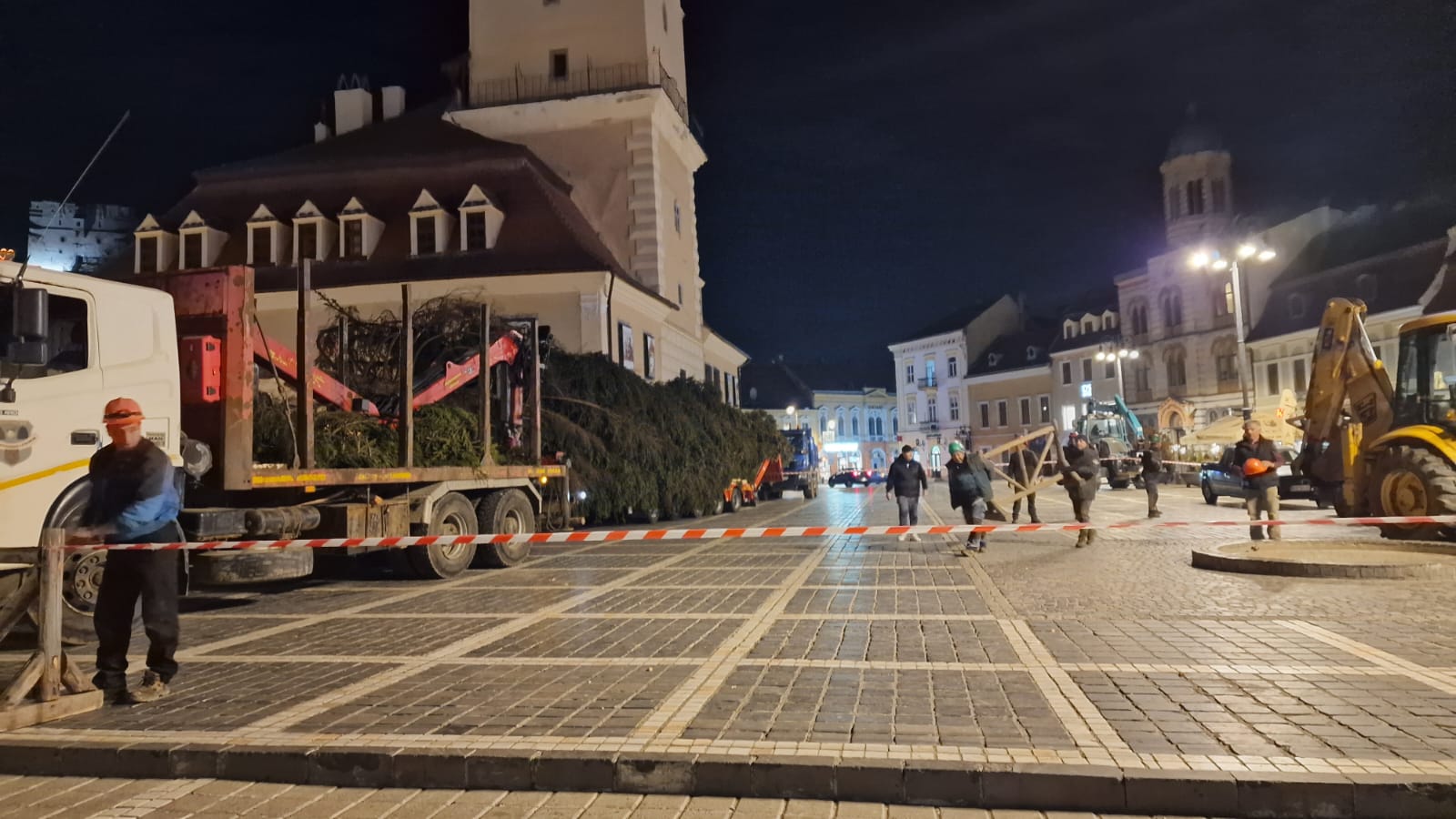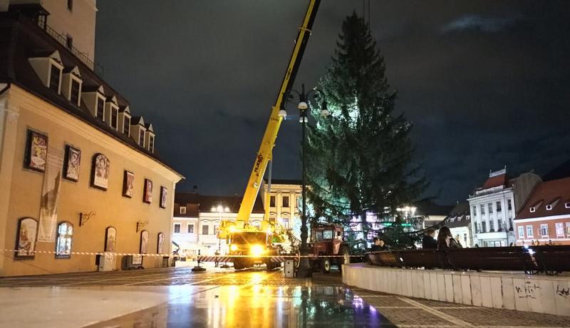 Montarea bradului din Piața Sfatului, o misiune deloc ușoară