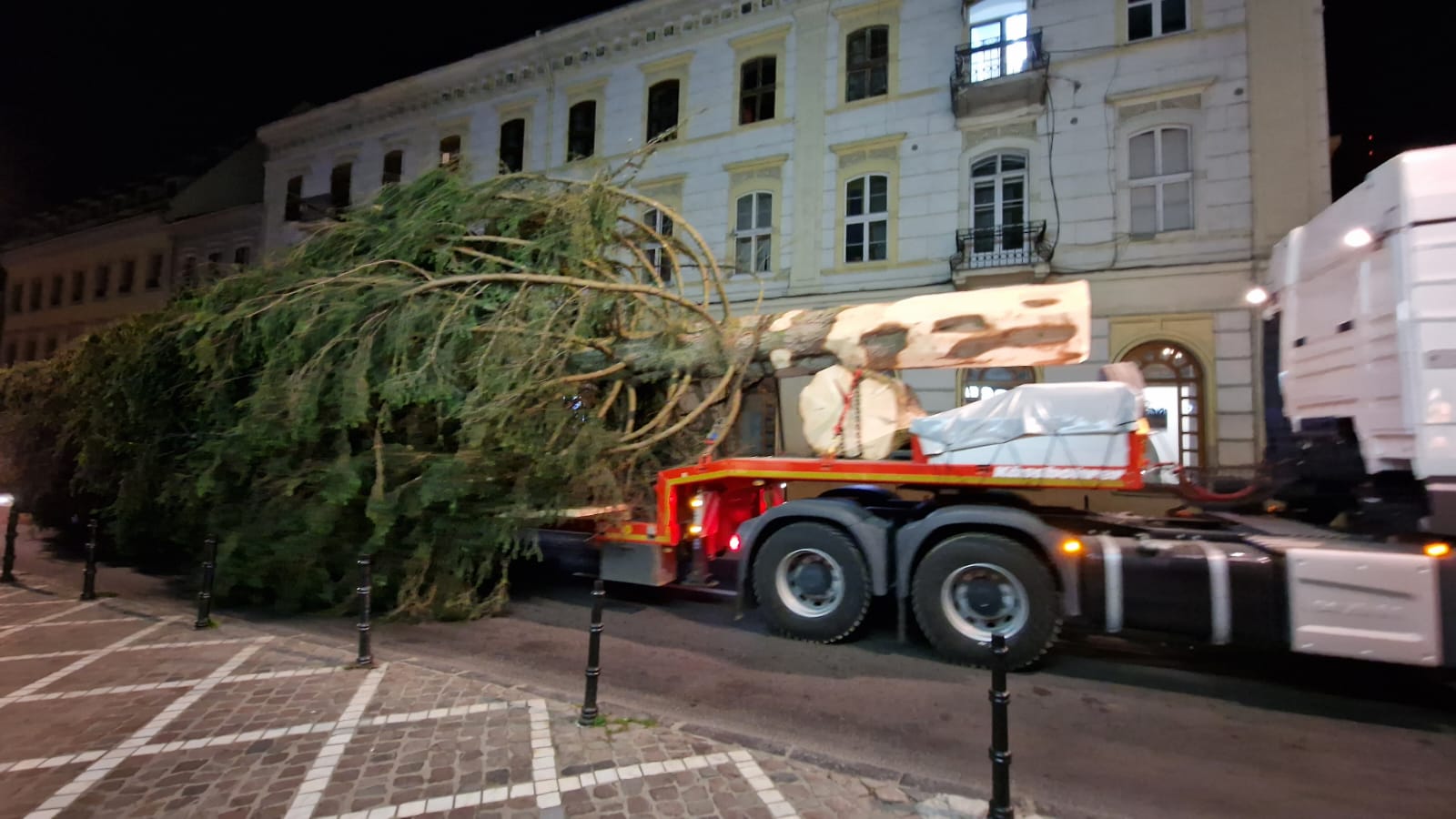 „Acesta este bradul care a fost ani la rând, vecin cu cel care a împodobit Brașovul anul trecut. Are o înălțime totală de 21 de metri, plus încă 3 metri în pământ și o greutate de 6,5 tone”, a spus directorul Regiei Publice Locale a Pădurilor Kronstadt, Dan Olteanu, în timp ce urmărea în Piața Sfatului lucrările de montare.